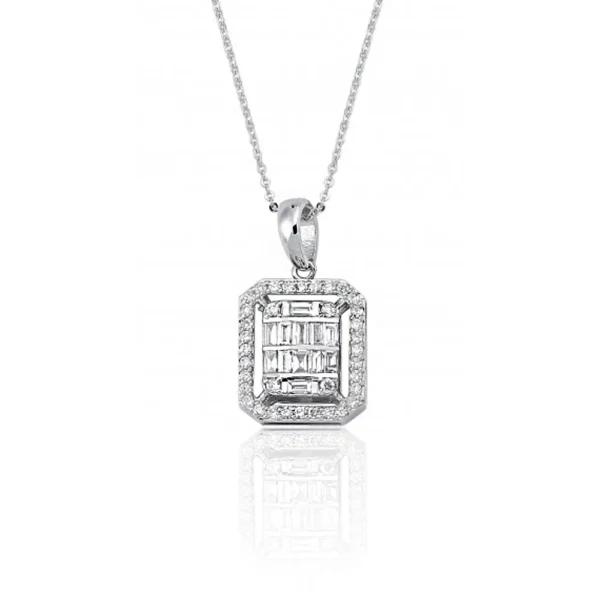 1.21 karat pırlanta baget taşlarla bezeli bu özel mozaik kolye, 14 ayar beyaz altınla tasarlandı ve ışıltısıyla göz kamaştırıyor.