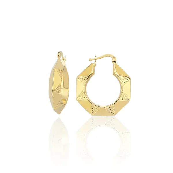 Sekizgen formu ve desenli tasarımıyla minik kulaklarda şıklık ve zarafet sunan 14 ayar yeşil altın halka küpe.
