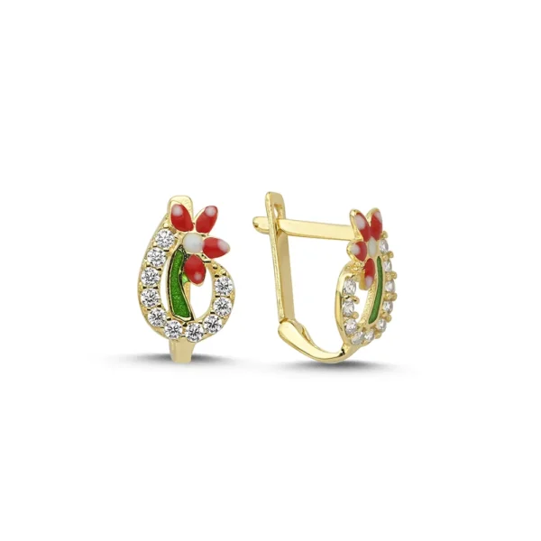 Çiçek figürü ve taş detaylarıyla minik kulaklarda zarif bir ışıltı sunan 14 ayar yeşil altın çocuk küpesi.