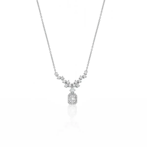 0.57 karat baget ve yuvarlak kesim pırlantalarla tasarlanmış bu çiçek formundaki kolye, zarafeti ve ışıltıyı bir araya getiriyor.