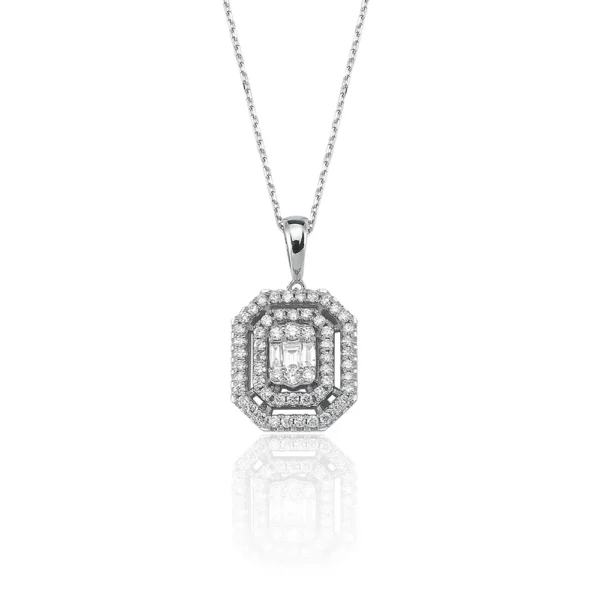 Katmanlı çerçeve tasarımıyla dikkat çeken 0.46 karat pırlantalı baget kolye, 3.74 gram beyaz altın ile şıklığınızı göz alıcı bir ışıltıyla tamamlar.