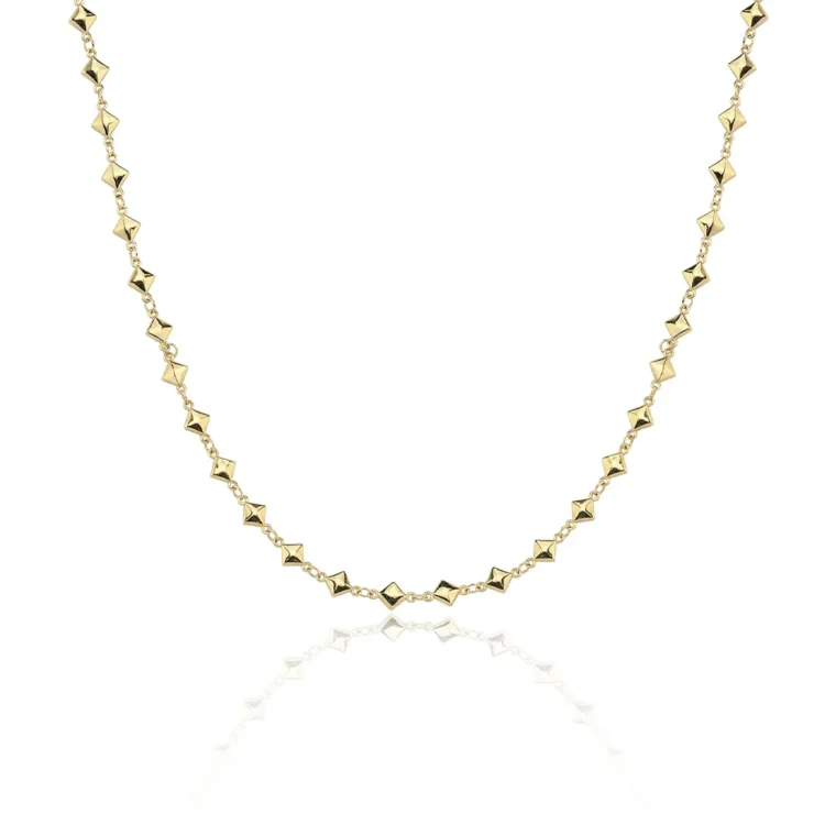 Modern tasarımıyla dikkat çeken 14 ayar sarı altın piramit zincir kolye, 8.55 gram ağırlığıyla güçlü bir stil duruşu sergiler.