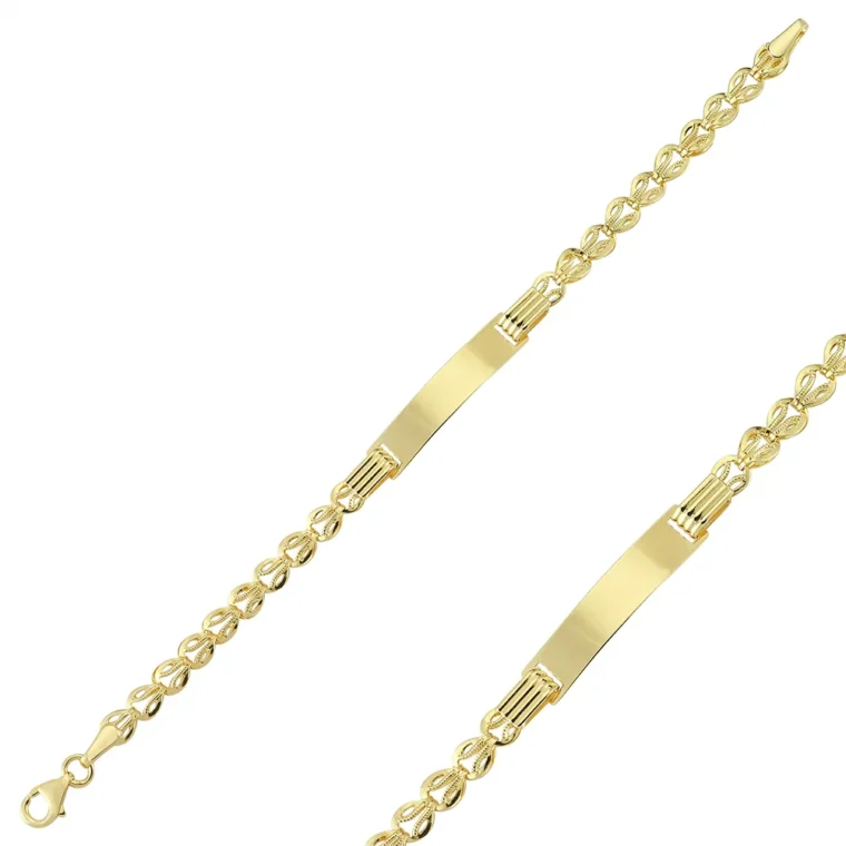 14 ayar yeşil altından üretilmiş, kabartmalı yüzeyi ve oval zincir tasarımıyla şık ve dayanıklı bir çocuk künyesi.