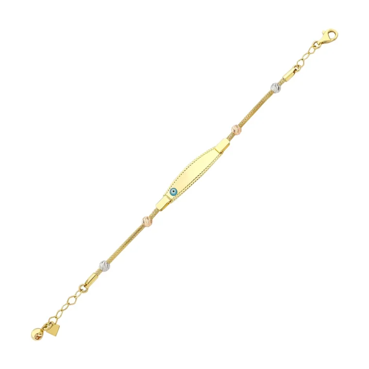 14 ayar üç renk altından üretilmiş Italy bebek künyesi, nazarlıklı ve zincirli tasarımıyla minik bileklerde hem şık hem koruyucu bir tercihtir.